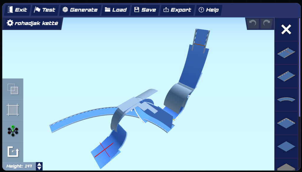 One look at the screenshot explains everything: Height: 147. That's not a typo. One hundred and forty-seven units of vertical real estate stacking curved blue ramps and spiraling road segments into the sky like a fever dream. The background is pure white void. The road is a chaotic bird-wing silhouette of intersecting arcs and steep banked curves, with a start pad sitting at ground level while the track explodes upward into the clouds. No scenery. No safety net. Just physics, momentum, and the slow realization that you are going to fall a very, very long way.